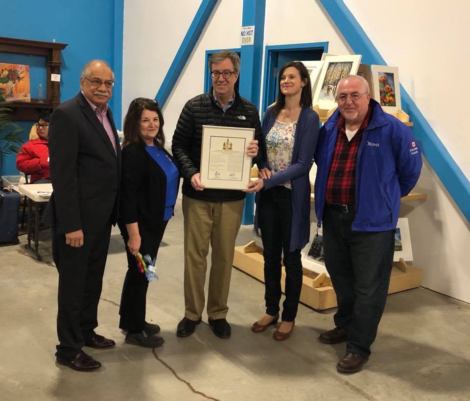 From left to right: Councillor Shad Qadri, Habitat GO Director of Retail Operations Myrna Beattie, Mayor Jim Watson, Habitat GO CEO Alexis Ashworth, and Councillor Allan Hubley.